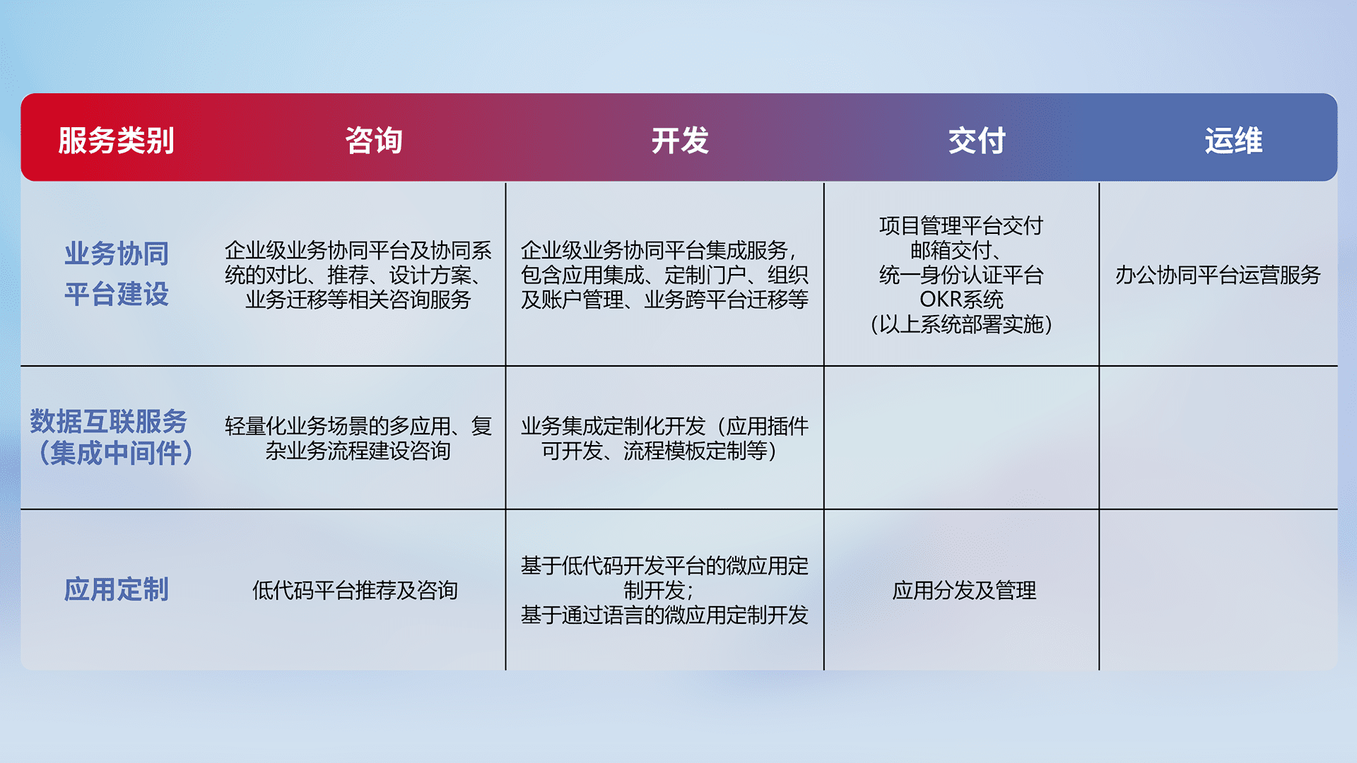 针对钉钉、、、企微、、、、IDaas等平台级产品提供产品的规划、、方案、、、交付、、定制化开发等服务,,实现如统一协同办公、、、、智能客户服务、、、混合会议管理、、、、智能数据查询、、、、等业务场景,,实现数字化转型。。。。