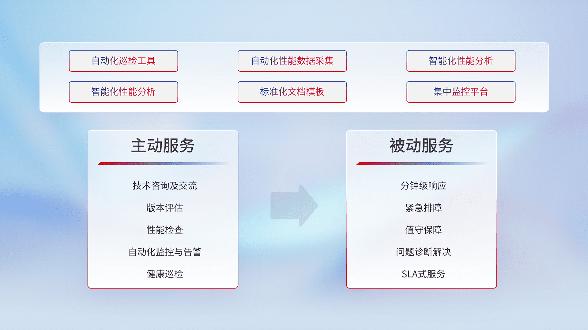 智能化工具和标准化文档,,保障服务质量,,,,提供主动服务(包含技术咨询、、、、版本评估、、性能检查、、自动化监控与告警、、、、健康巡检)和被动服务包含(分钟级响应、、、、紧急排障、、、值守保障、、、问题诊断解决、、、SLA服务)。。